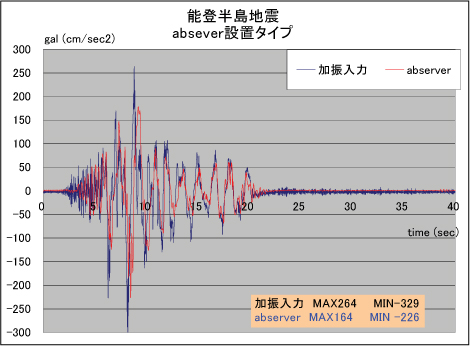 By this proof experiment, abserver® was able to reduce input wave of 1100gal (seismic intensity of 7 super class) to 140gal (seismic intensity 4 to 5).